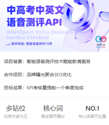 项目背景:智能语音评测赋能教育服务 合作项目:SEM托管聚合全案SEO优化 目标成果:KPI考核量提前一个月完成